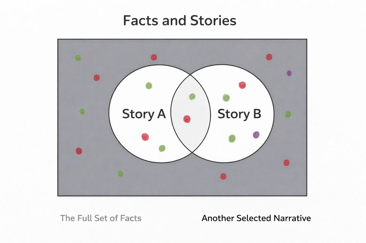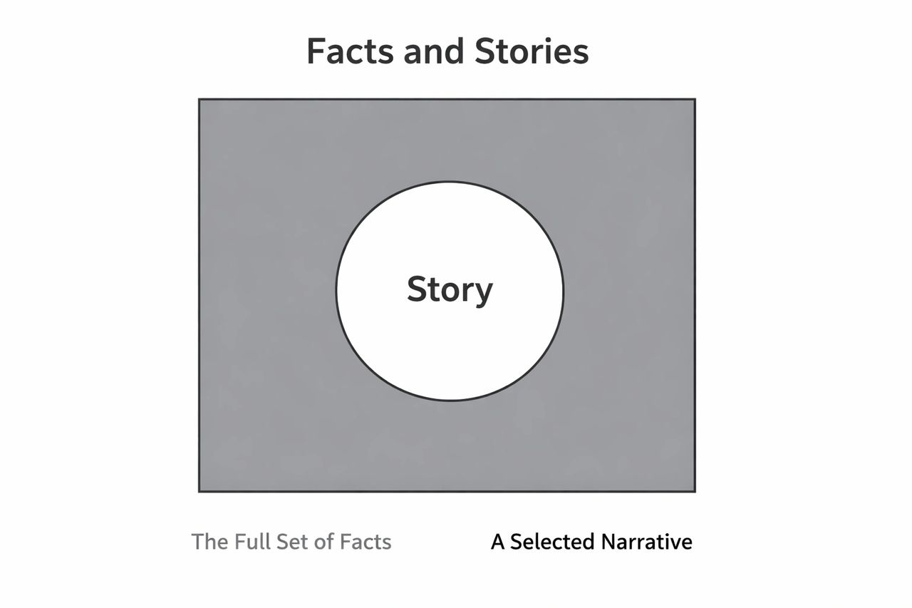 Imagine the full set of facts as a large grey square - everything that is true, everything that bears on the question. Within that square, you can draw a circle: a story. The story selects certain facts and organises them into a coherent narrative. It contains real information. It is not a fabrication. But it is not the grey square.